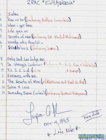 This first handwritten tracklist reflects the three first days of recording of 2Pac at Death Row, released from prison the 12th, starting to record the next day...