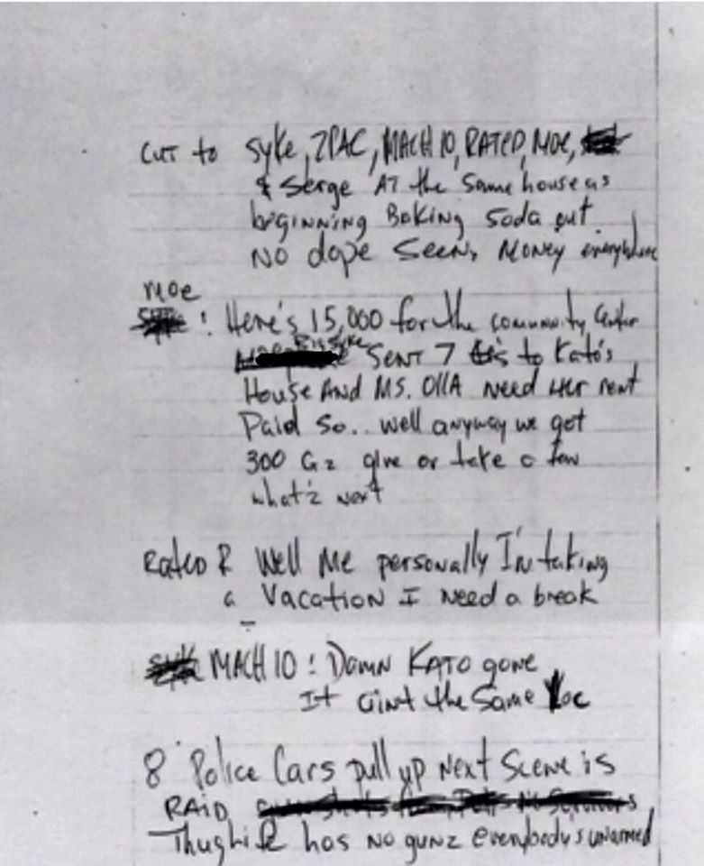 These are the pages following the handwritten concept tracklist/guestlist titled "Honor Among Thugz". It tells the story of Kato's death. Is it close to what really happened ? There are for sure many differences : Mopreme was not with 2Pac and Thug Life in Apr. 96, 2Pac just gave him a role. 2Pac turns that episode happened during Thug Life genesis into a typical ghetto tragedy : party, drug & alcool, gang fuss and traps, car chase, firefight car, police, burial ceremony, pain...